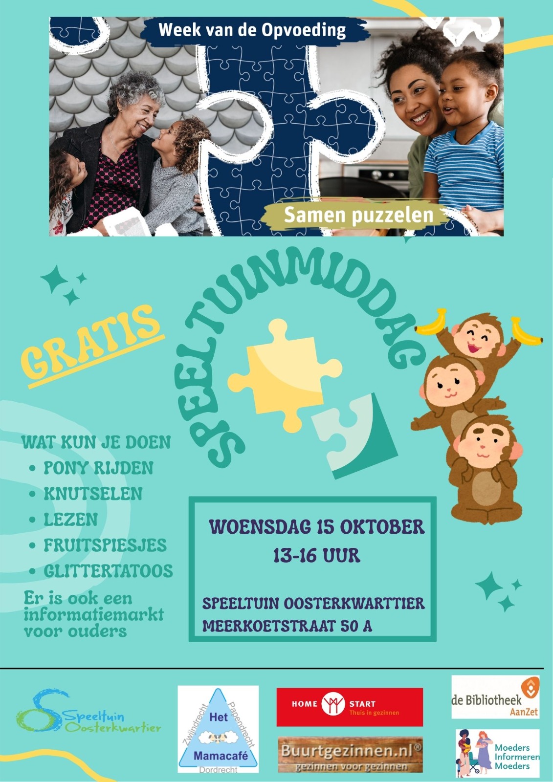 - Woensdag 15 oktober 13.00 - 16.00 uur: Speeltuinmiddag bij de speeltuin Oosterkwartier, Meerkoetstraat 50A. Je kunt pony rijden, knutselen, lezen, er zijn fruitspiesjes en glittertattoos! Er is ook een informatiemarkt voor ouders.